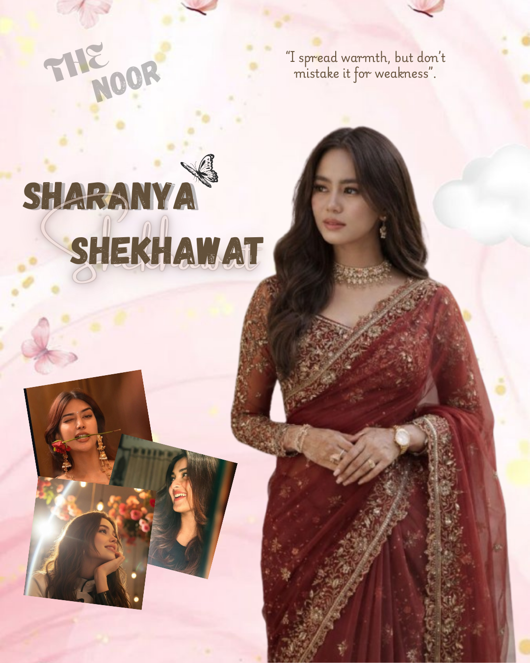 Sharanya Shekhawat an upper middle-class girl belongs from Bihar but lives in Delhi with whole family. She is doing her MBA. Soft, cute, bubbly and kind but also a troublemaker. She is clumsy a bit but likes to live life whole heartedly. She is the live of party or you can say "mehfil ki jaan". She is 23 yrs old but of course looks like a sweet sixteen girl. She is only girl child of her house so also a little bit of demanding and attention seeker which she gets without any efforts.